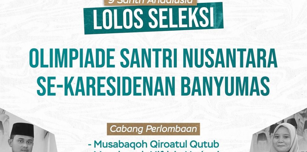 Post Views: 1,585 Banyumas (20/10/2024) – Sebanyak 9 santri dari Pondok Pesantren At-Taujieh Al-Islamy 2 Andalusia berhasil lolos seleksi Olimpiade Santri Nusantara (OSN) tingkat Karesidenan Banyumas, dengan 7 di antaranya berasal dari Ma’had Aly Andalusia. Seleksi ini merupakan bagian dari peringatan satu abad Pondok Pesantren Al Falah Ploso dan digelar di Pondok Pesantren Misbahul Falah, … Lanjutkan membaca 9 Santri Andalusia Lolos Seleksi Olimpiade Santri Nusantara Se-Karesidenan Banyumas