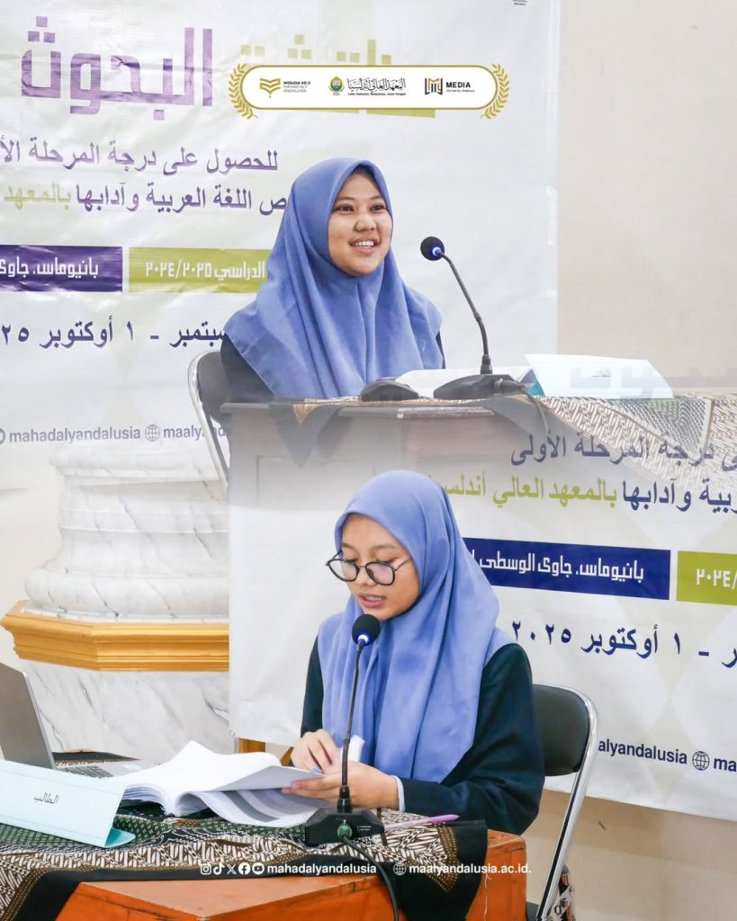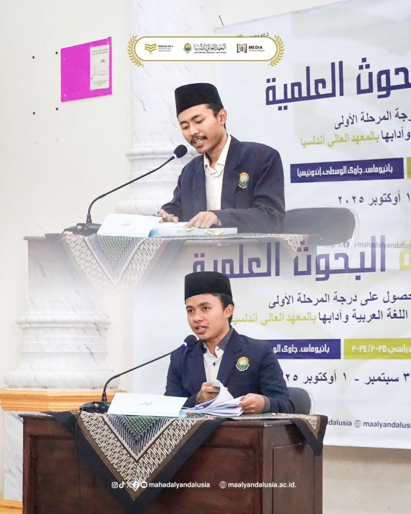 0Banyumas, 1 Oktober 2025 – Ma’had Aly Andalusia Banyumas menyelenggarakan Sidang Munaqasyah (ujian akhir skripsi) Angkatan Kedua pada 30 September hingga 1 Oktober 2025 di Gedung Zawiyah. Kegiatan ini dihadiri oleh jajaran pimpinan, dosen pembimbing, serta melibatkan beberapa dosen eksternal dari perguruan tinggi Islam terkemuka di Indonesia. Salah satunya adalah Dr. Sugeng Haryadi, Lc., M.A. dari Universitas Islam Sultan Agung (Unissula) Semarang. Dalam pengamatannya, Dr. Sugeng menilai bahwa para calon alumni menampilkan dua aspek metodologis dalam penelitian yang dipresentasikan. Pertama, penelitian bertema tematik atau dirasah maudhū‘iyyah ta‘līliyyah (دراسة موضوعية تحليلية). Kedua, penelitian berupa literature review terhadap manuskrip-manuskrip berbahasa Arab atau dirasah taḥqīqiyyah (دراسة تحقيقية).